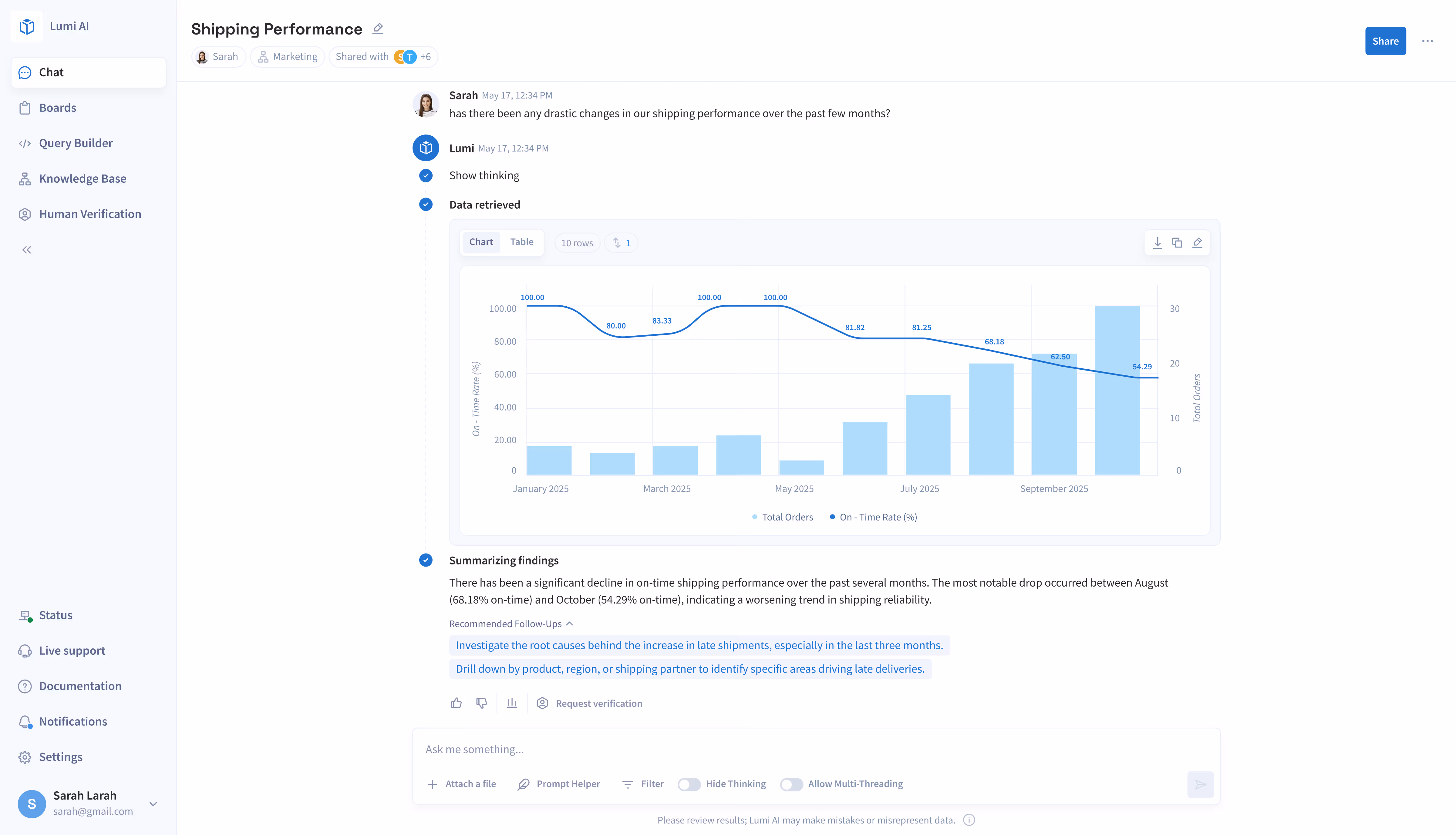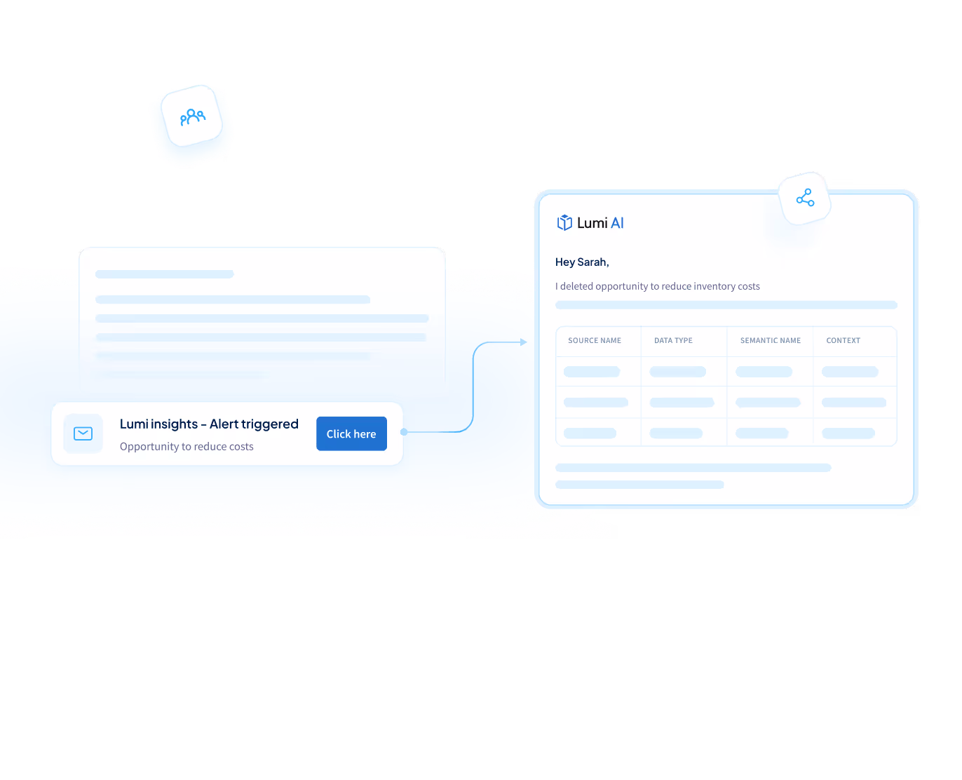 Agentic analytics is proactive. Lumi shares alerts for issues or opportunities before they escalate for better, faster decision-making.