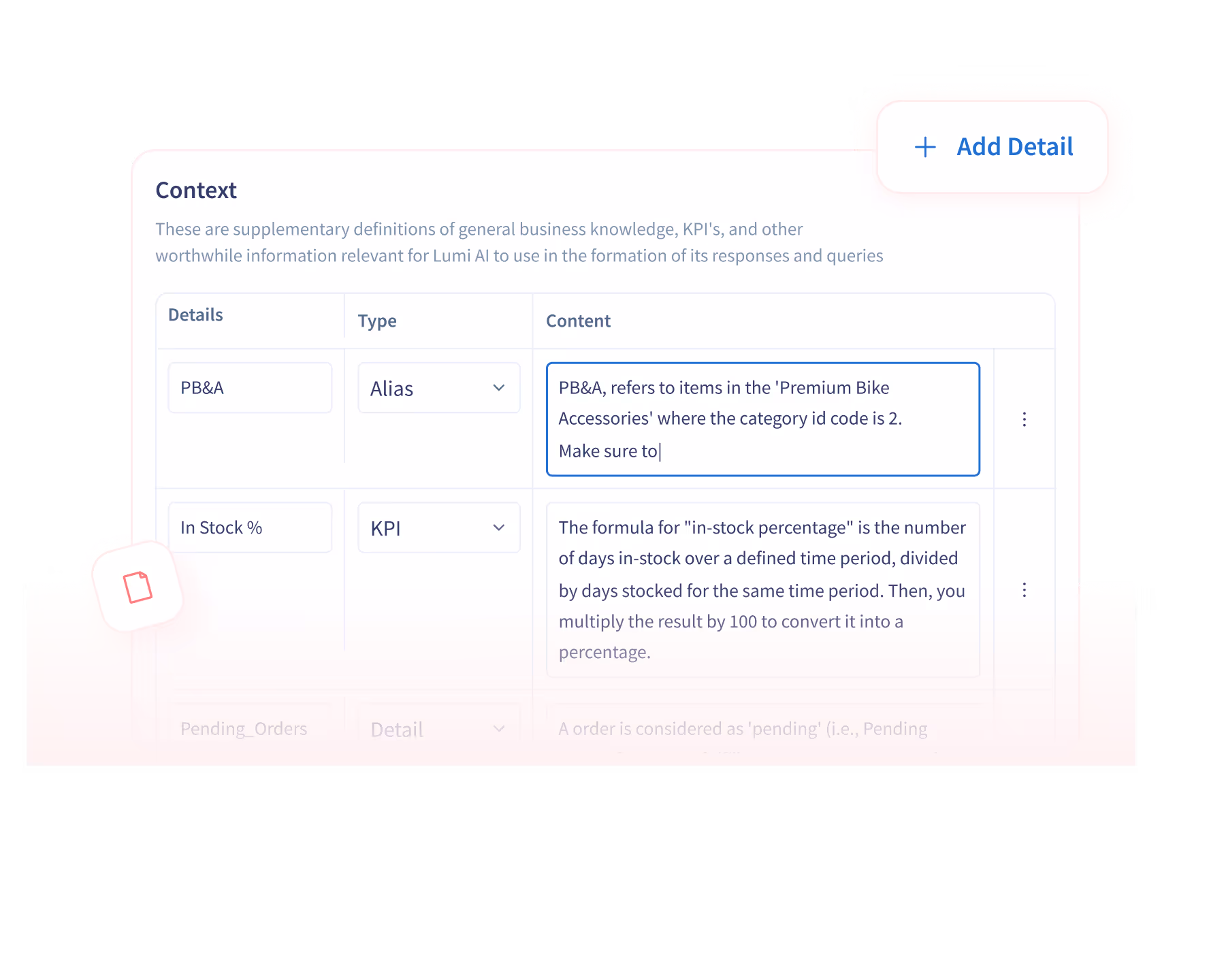 Context is king in AI analytics. Lumi offers the market's most sophisticated knowledge management feature set to ensure precise, consistent output.