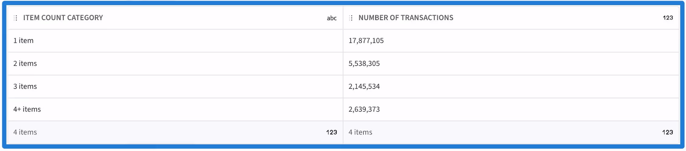 “Can you show me the number of transactions grouped by basket size specifically, transactions with 1 item, 2 items, 3 items, and 4 or more items?”
