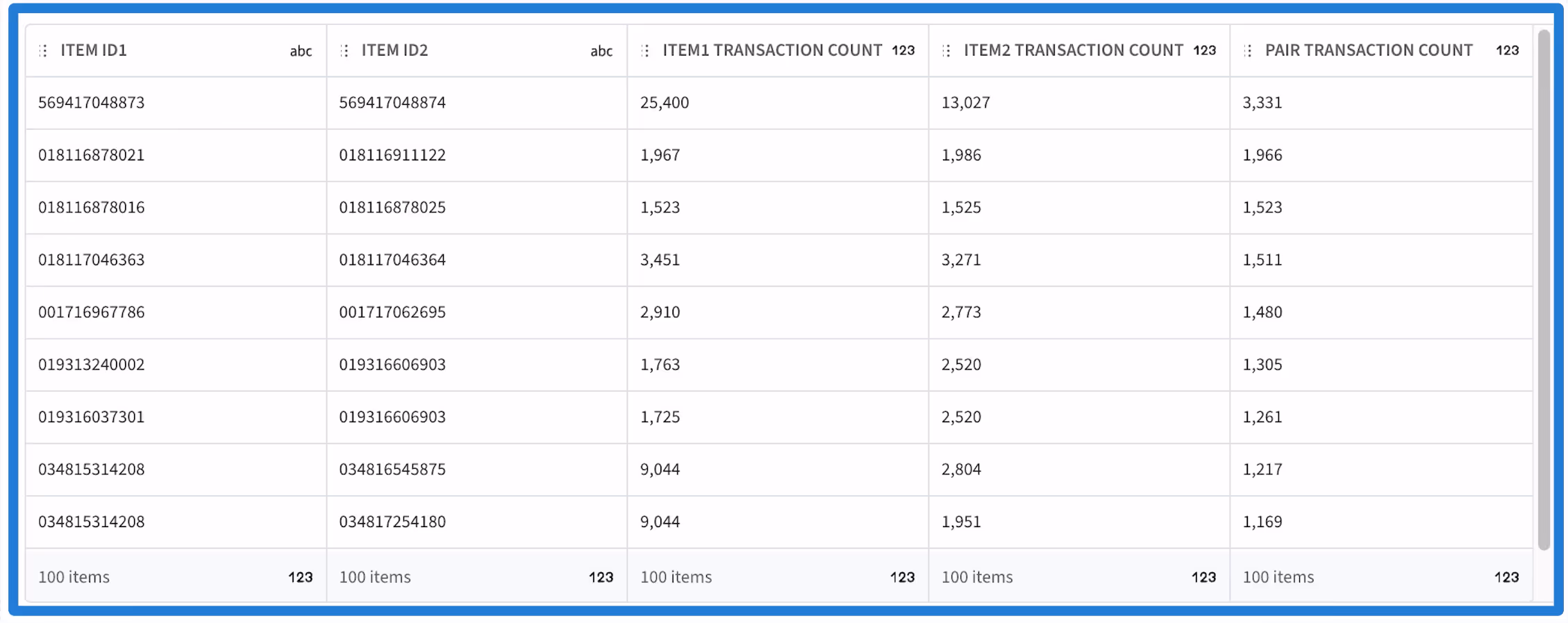 Lumi returns a full basket analysis report. In this case, if Item A → Item B has a confidence score of 0.80, it means 80% of the time customers buy A, they also buy B. Sorting by descending confidence indicates the strongest product relationships. Lumi also generates summaries pointing out top bundling opportunities by item ids.