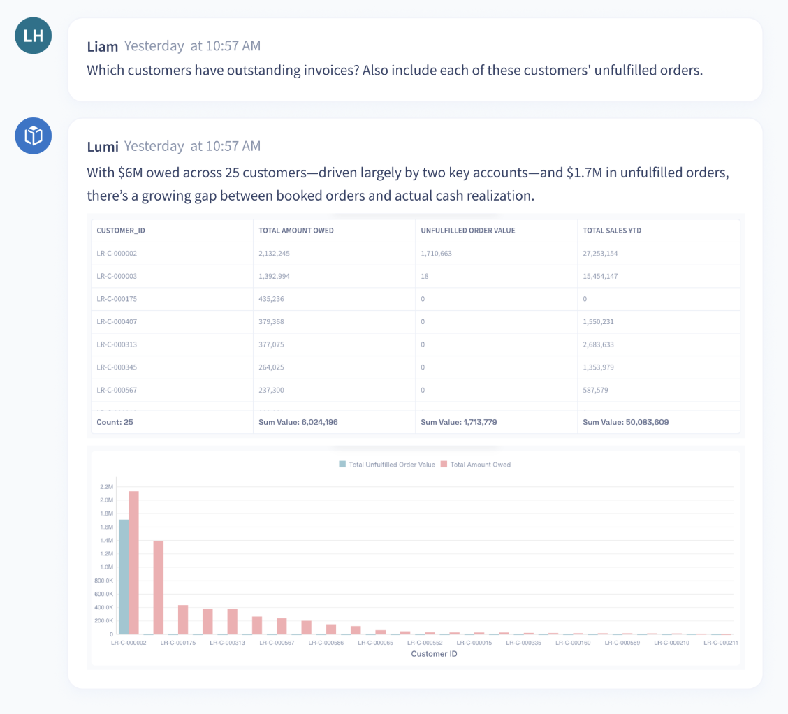 Lumi enabled a side-by-side analysis of sales and accounts receivable by cross-referencing overdue invoices with open orders. This quickly highlighted high-risk accounts and provided actionable insights.