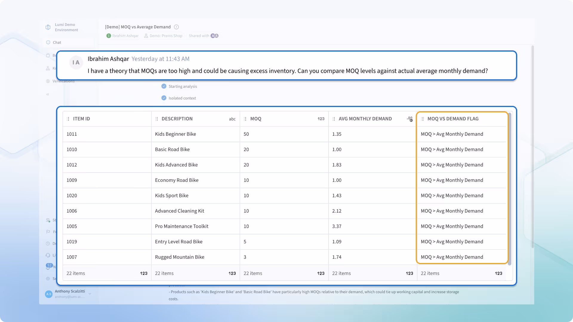 Lumi interprets the intent and automatically searches for relevant fields, such as MOQ per item, recent purchase volumes, and monthly demand averages.