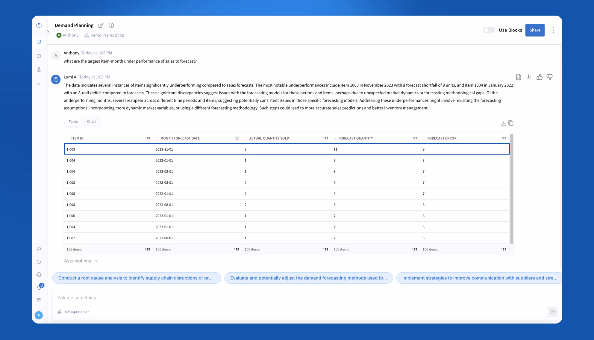 Outcome: Lumi AI generated a prioritized list of item-month combinations with the greatest positive forecast error (forecast quantity exceeding actual sales). The analysis revealed, for example, that Item 1003 in November 2023 had a forecast shortfall of 9 units (only 2 units were sold against an 11-unit forecast).