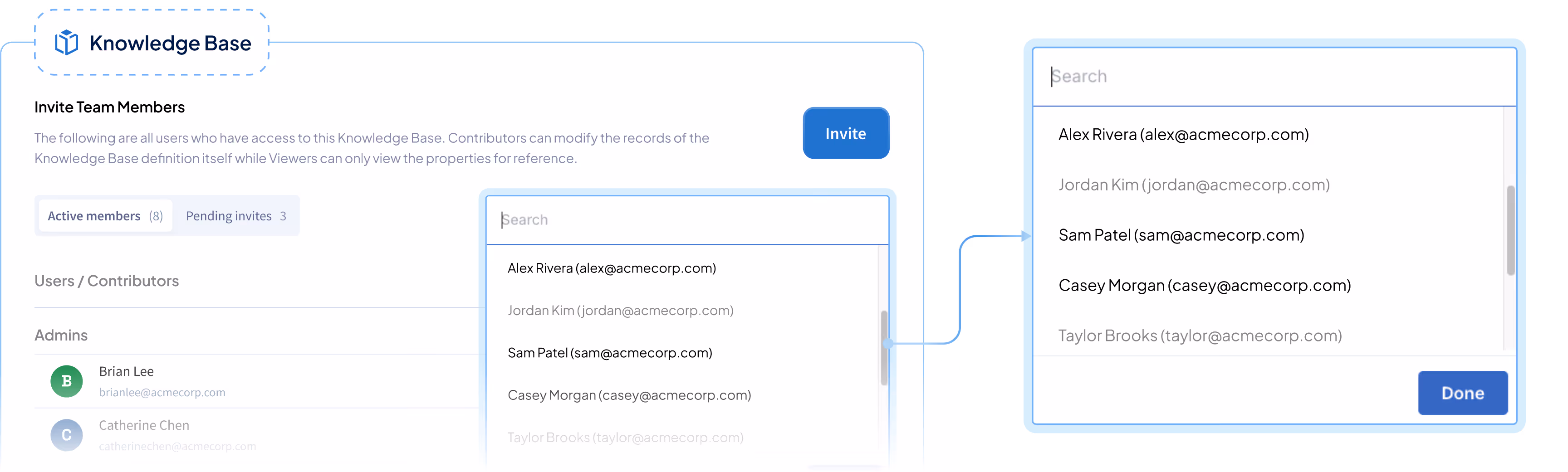 Different teams require different data access. Configure data connections, permissions, and rules independently for each knowledge base to enforce clear scope boundaries.